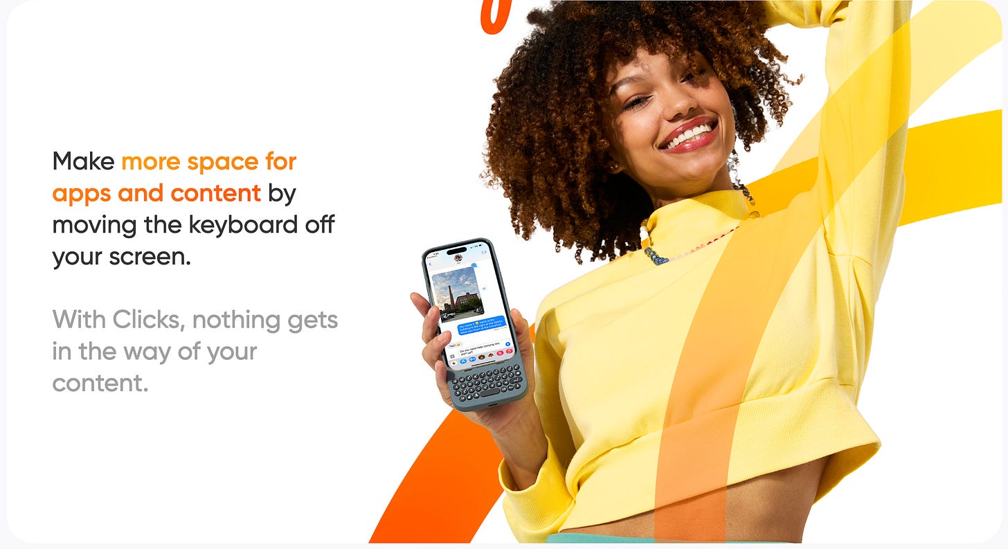 Clicks says the value in its keyboard for the user is in how it frees up valuable screen space for modern mobile apps, which is the opposite of what Steve Jobs said many years ago. The company is positioning it as “the first creator keyboard for iPhone,” which also falls in line with targeting young smartphone users craving older tech. They live-stream videos and chat with their viewers on screen while doing it. They consume influencer content and create their own. "With Clicks,” the company says, “nothing gets in the way of your content.” Clever.